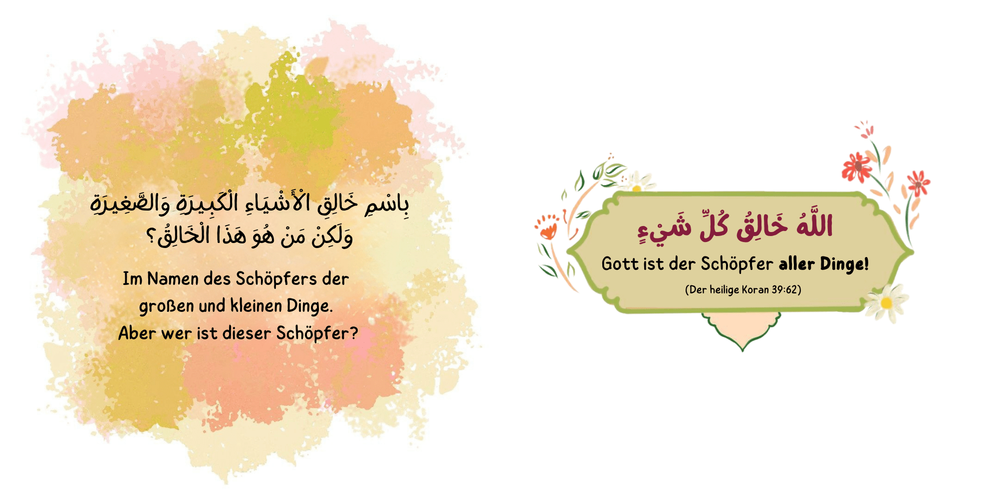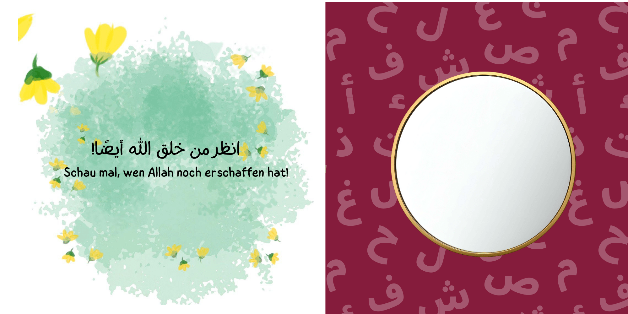 Wir präsentieren unser erstes Naml Arabia Projektbuch für die kleinsten Muslime. Es vermittelt auf spielerische und sanfte Weise einen Koranvers über die Schöpfung, der Kindern begreifbar macht, dass alles um sie herum erschaffen wurde von Allah – ob Tiere, Natur oder Umgebung. Die Gestaltung ist bewusst einfach, klar und visuell ansprechend, sodass Kinder ab 1 Jahr intuitiv Zugang finden.