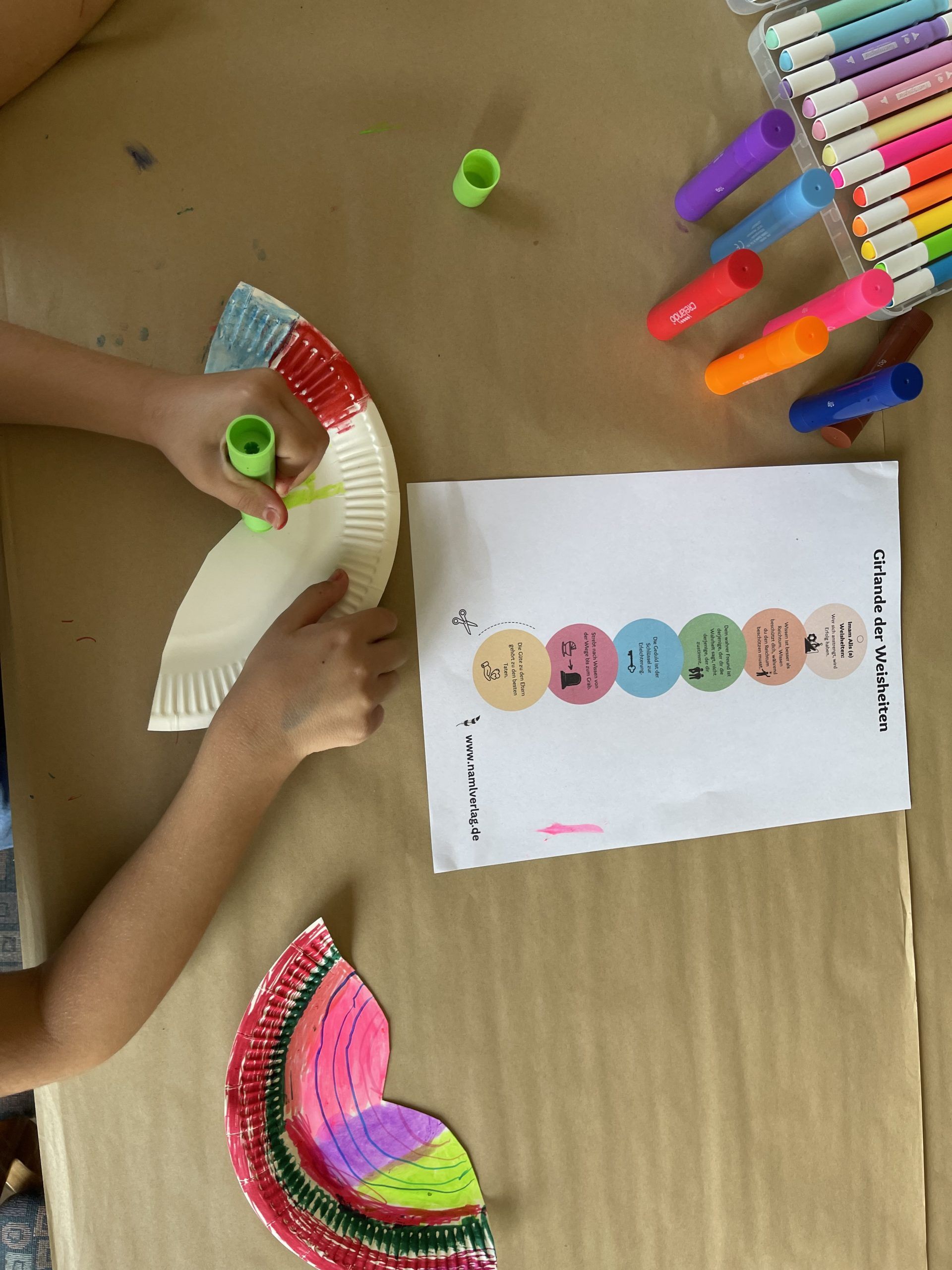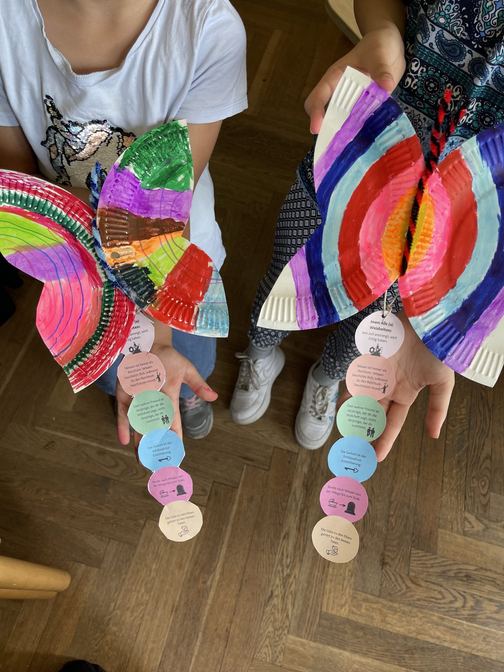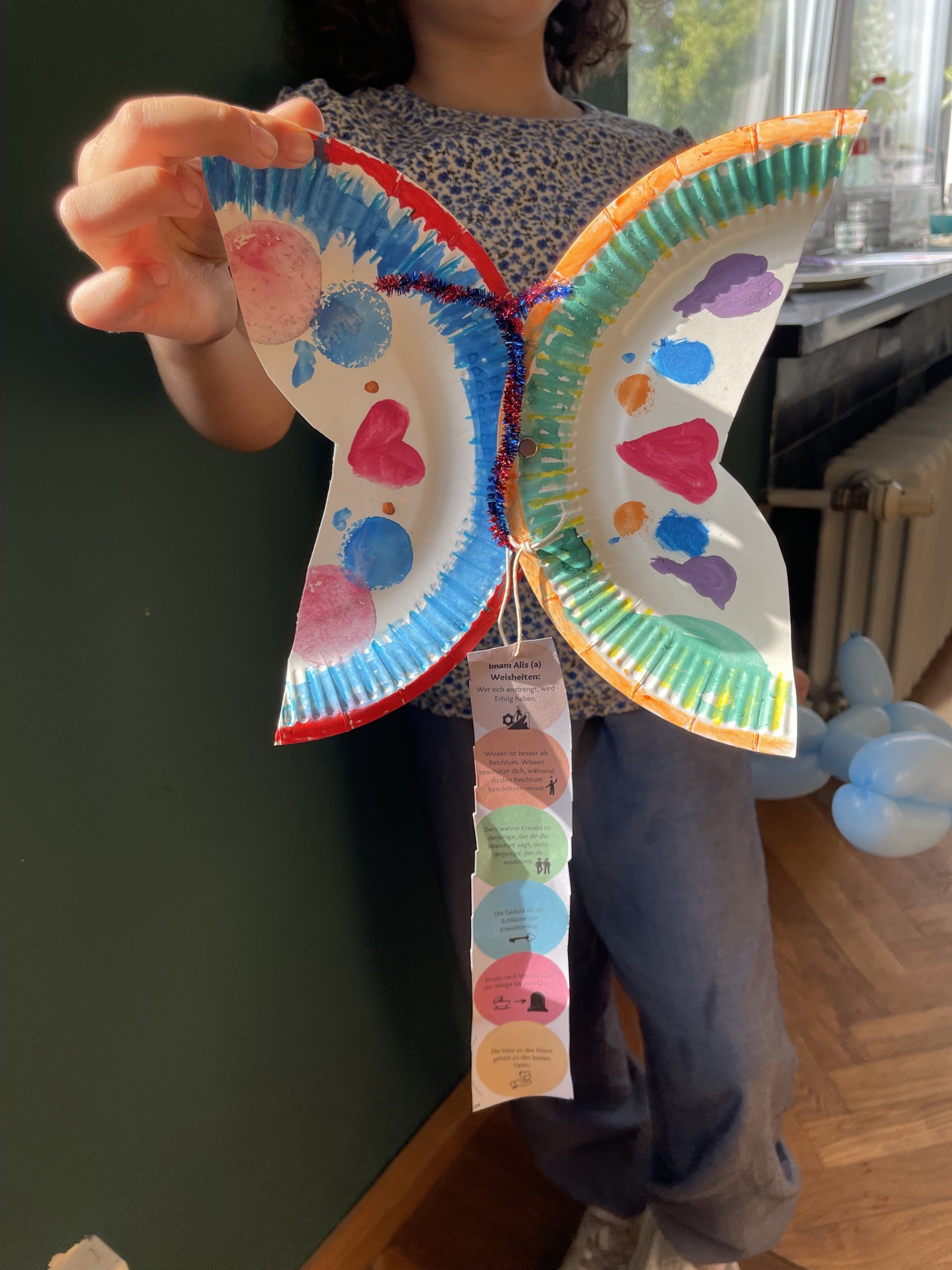 Erwecke die Kreativität deiner Kinder mit unserem speziellen Bastelprojekt zu Eid al-Ghadir! Sei es eine Rakete, ein Vogel oder wie in unserem Fall ein wunderschöner Schmetterling, der eine inspirierende Girlande trägt.